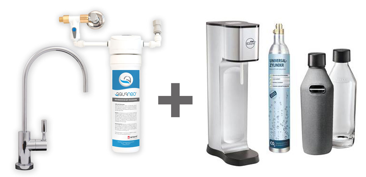 Mit der Kombination AQUANEOvital Basic und dem AQUANEOSodapop Joy Prestige erhalten Sie aus gefiltertem Leitungswasser kostengünstig Sprudelwasser in Premiumqualität.